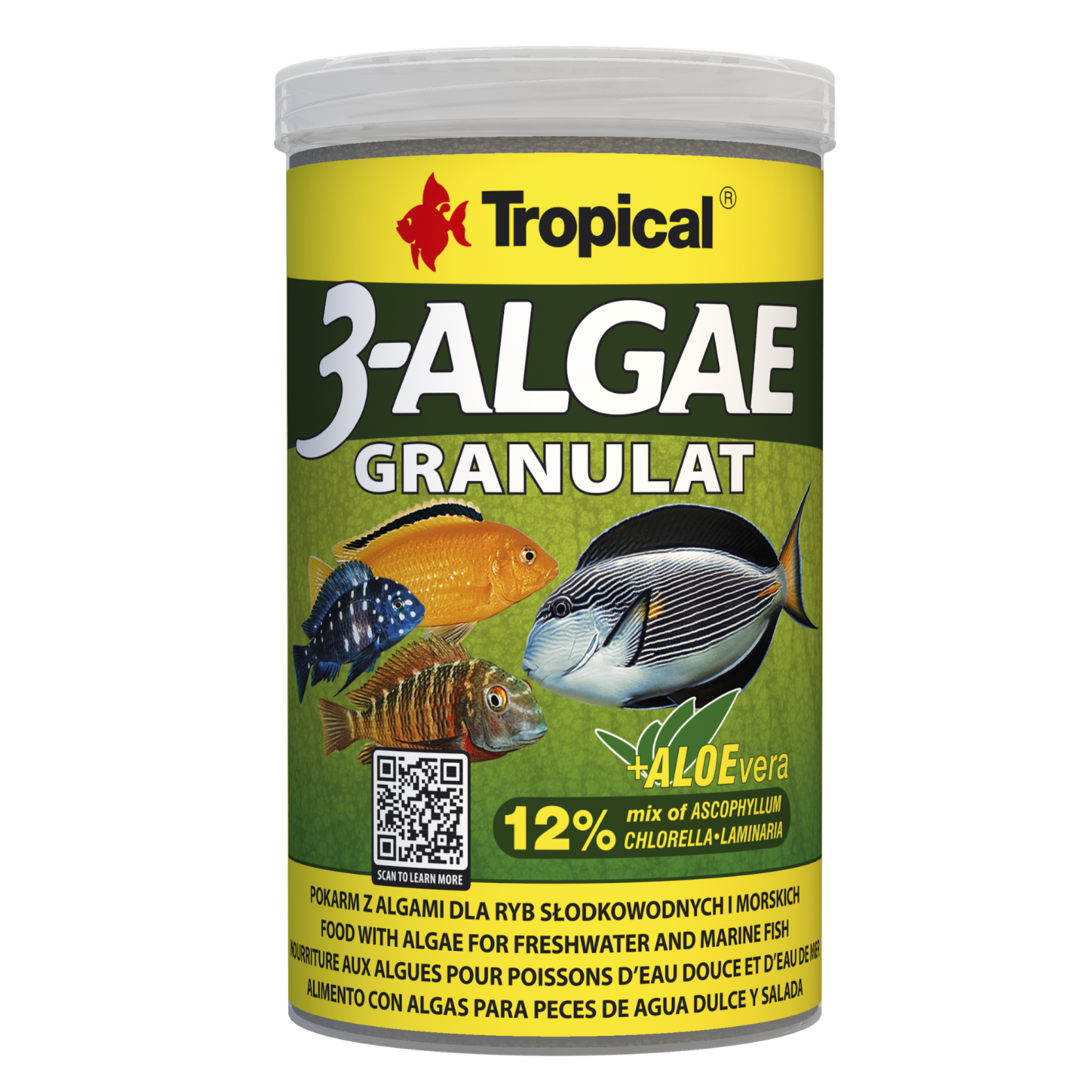 3-ALGAE de Tropical es un alimento ligero y delicado, rico en algas, diseñado para la alimentación diaria de peces herbívoros de agua dulce y salada cuya dieta está basada en algas, así como para peces omnívoros como alimento complementario.
